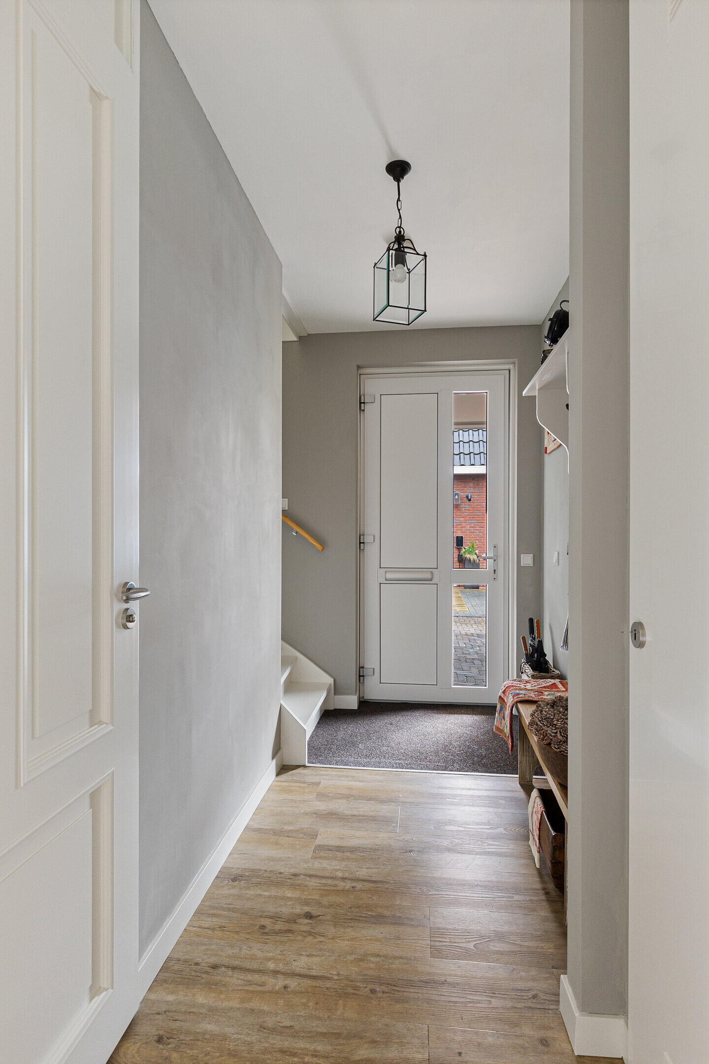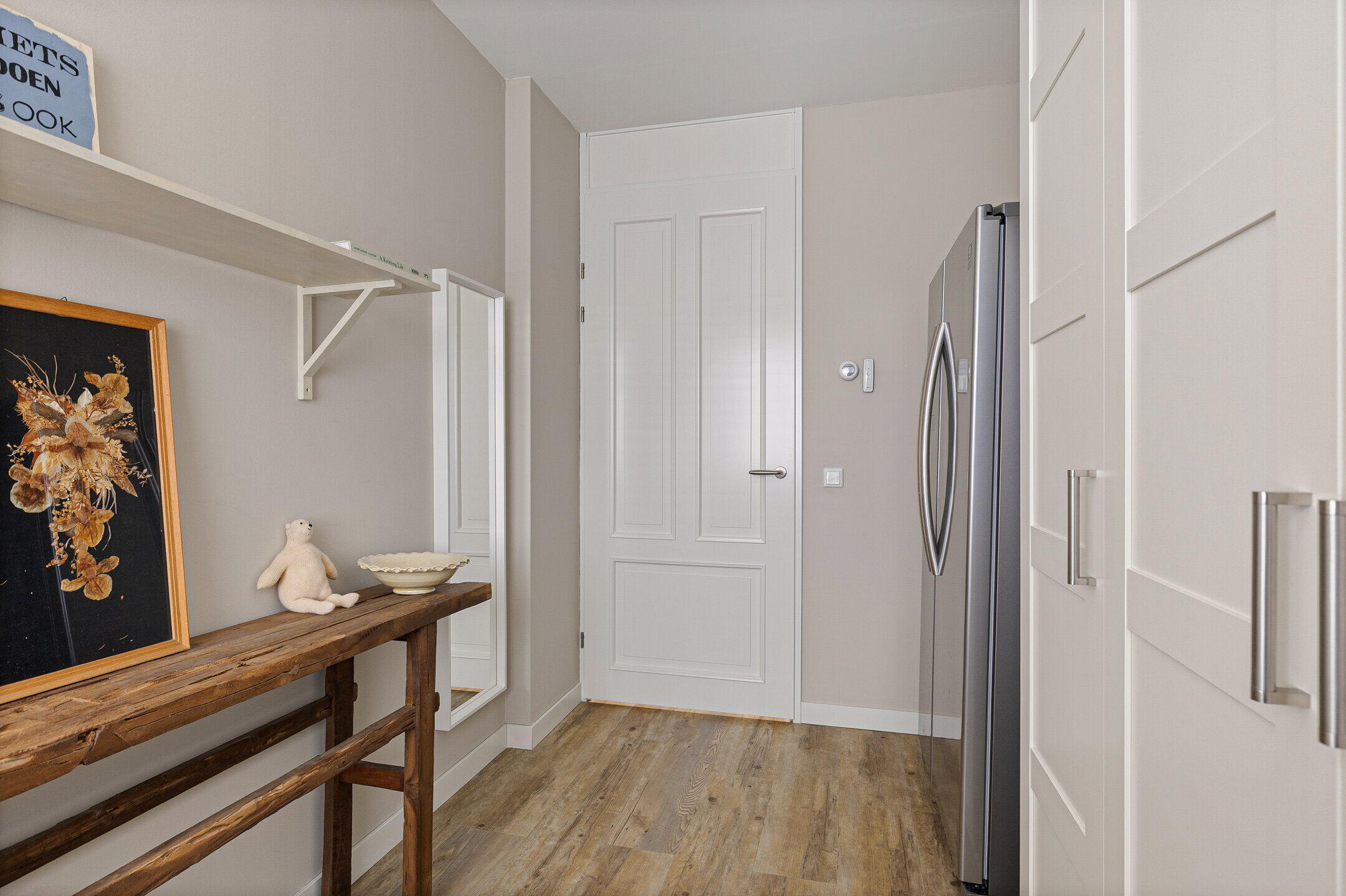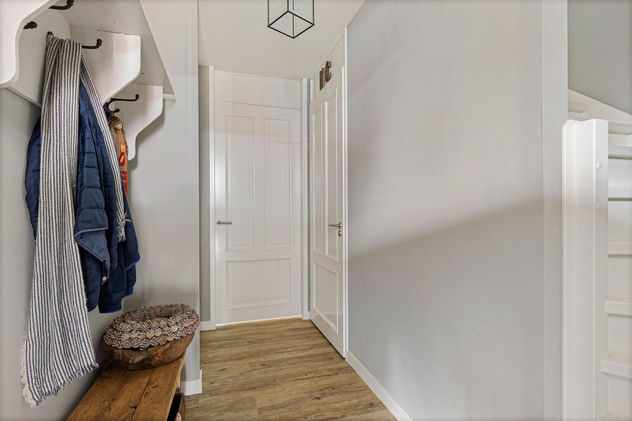 Entree met hal en toilet, meterkast en de trapopgang naar de verdieping. De gehele begane grond is afgewerkt met een moderne PVC-vloer, wat zorgt voor een strakke en onderhoudsvriendelijke uitstraling.