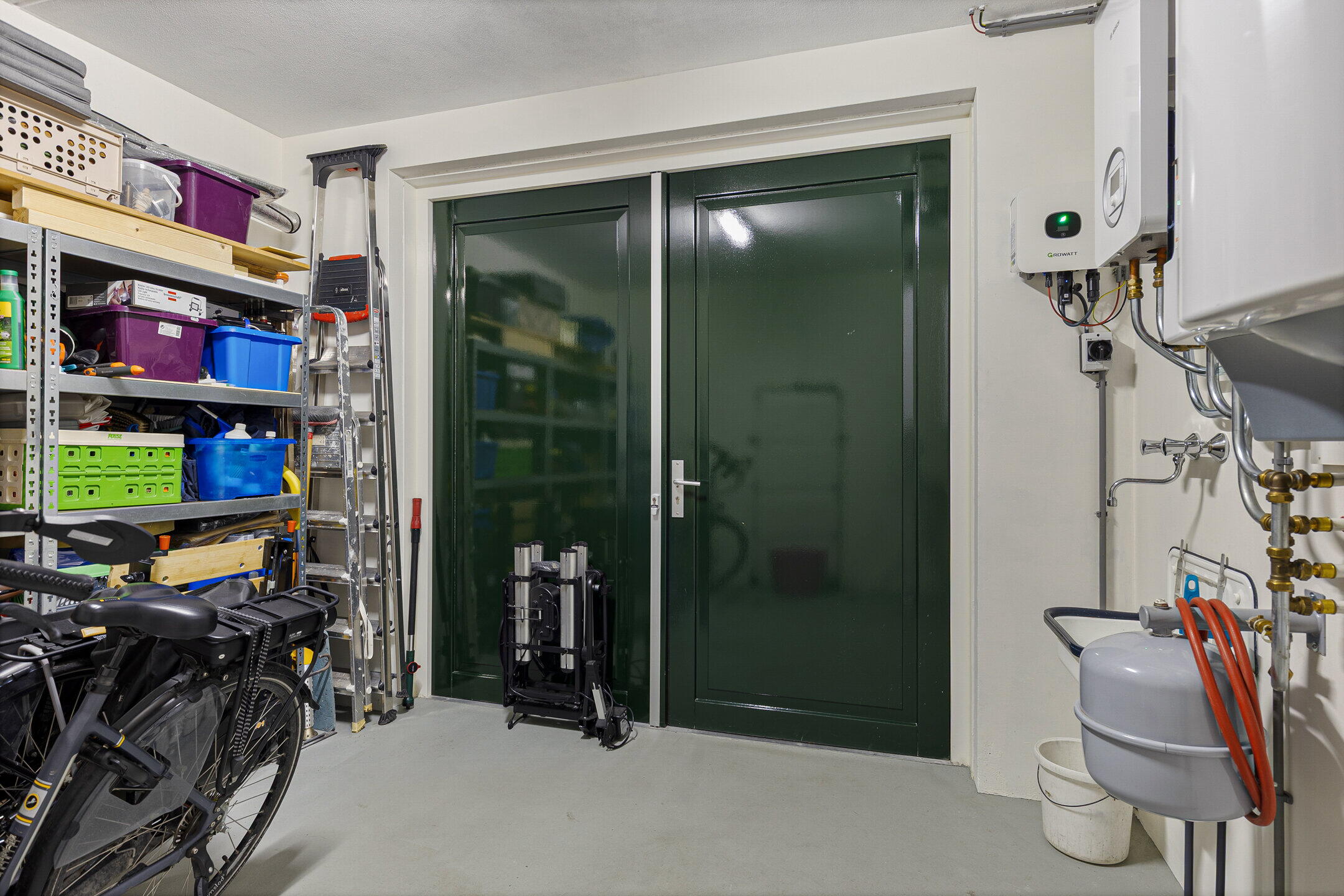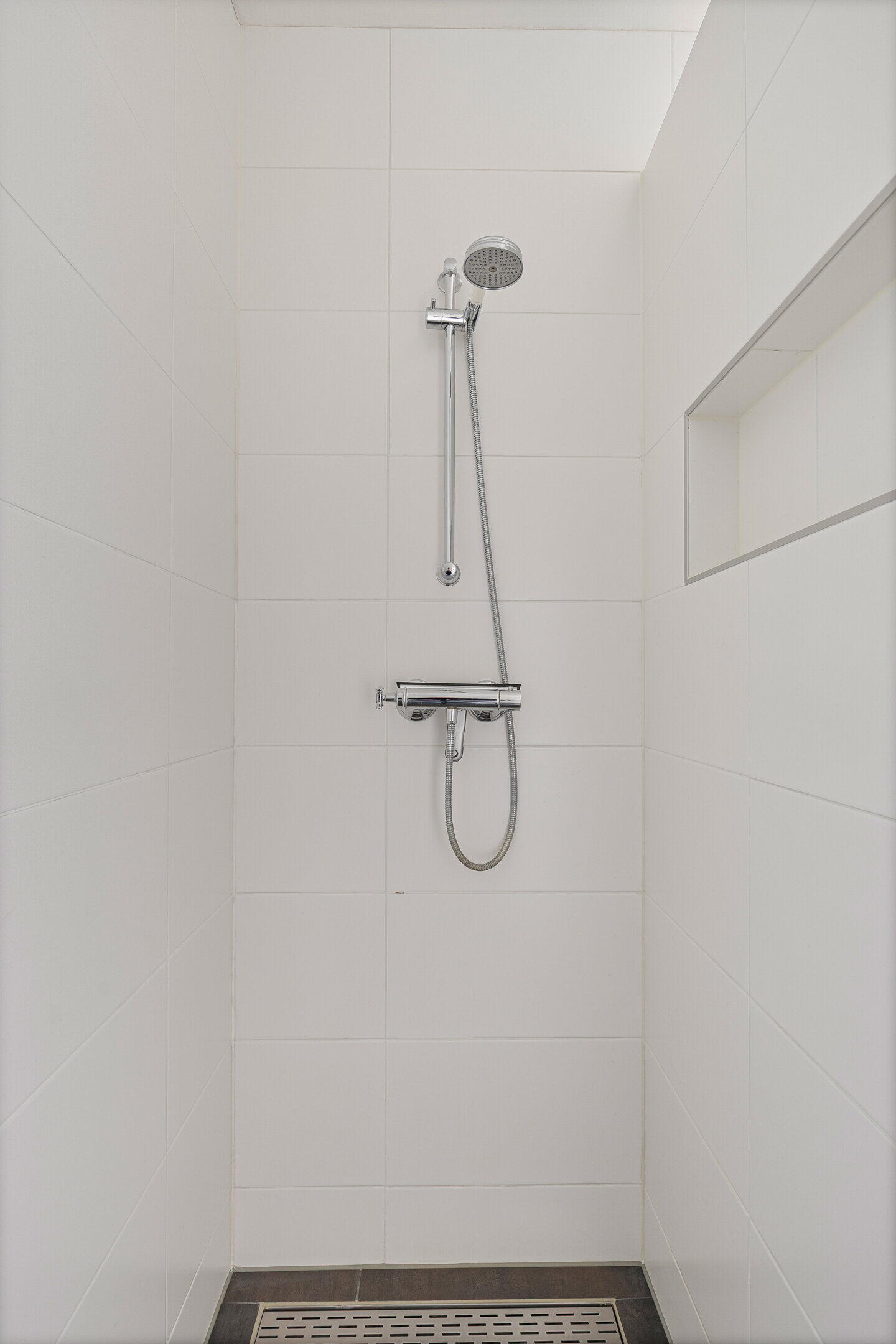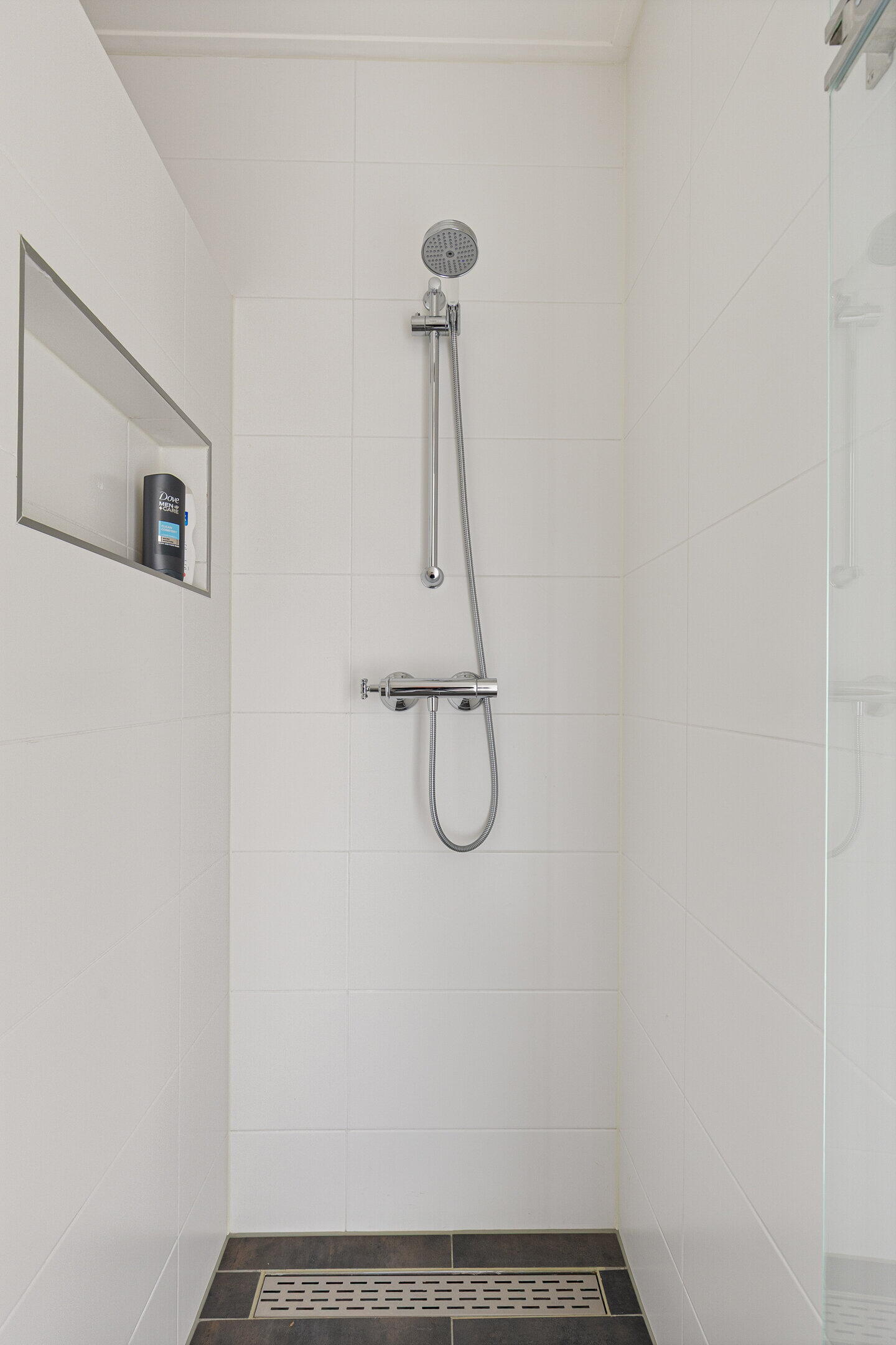 De badkamer is compleet en modern uitgevoerd met een toilet, inloopdouche en een wastafelmeubel. In de hal bevindt zich een op maat gemaakte kastenwand met de witgoedopstelling, waardoor alles netjes is weggewerkt. Vanuit de hal is ook de inpandige garage bereikbaar, met een technische ruimte waarin de cv-installatie, hybride warmtepomp en omvormer van de zonnepanelen zijn gesitueerd.