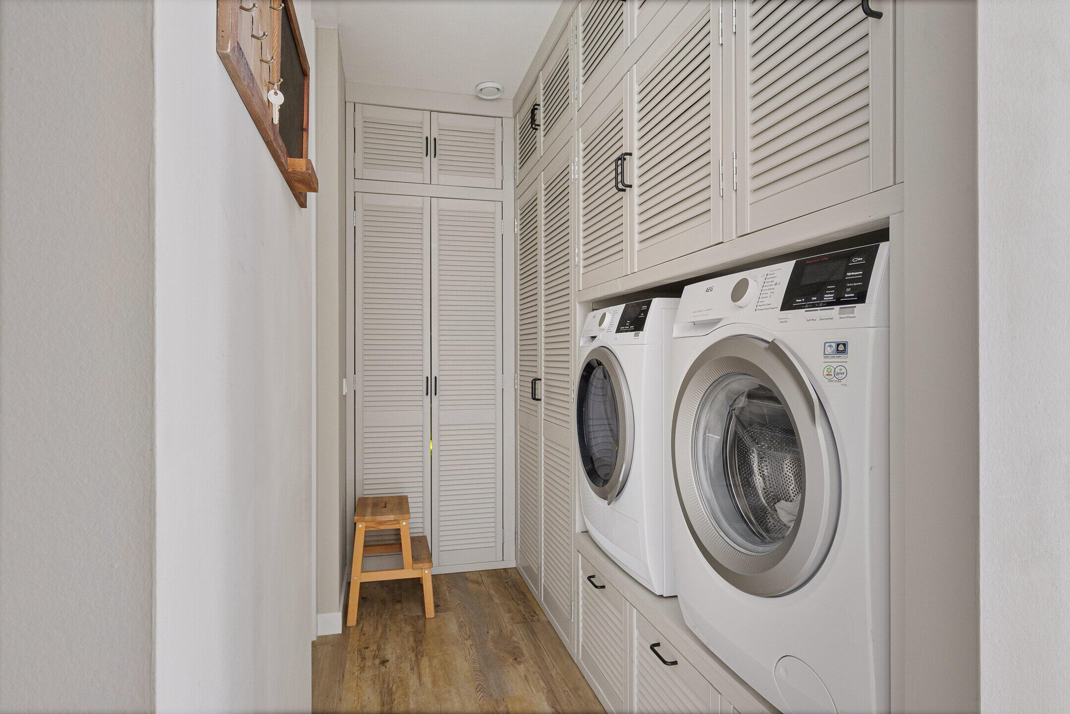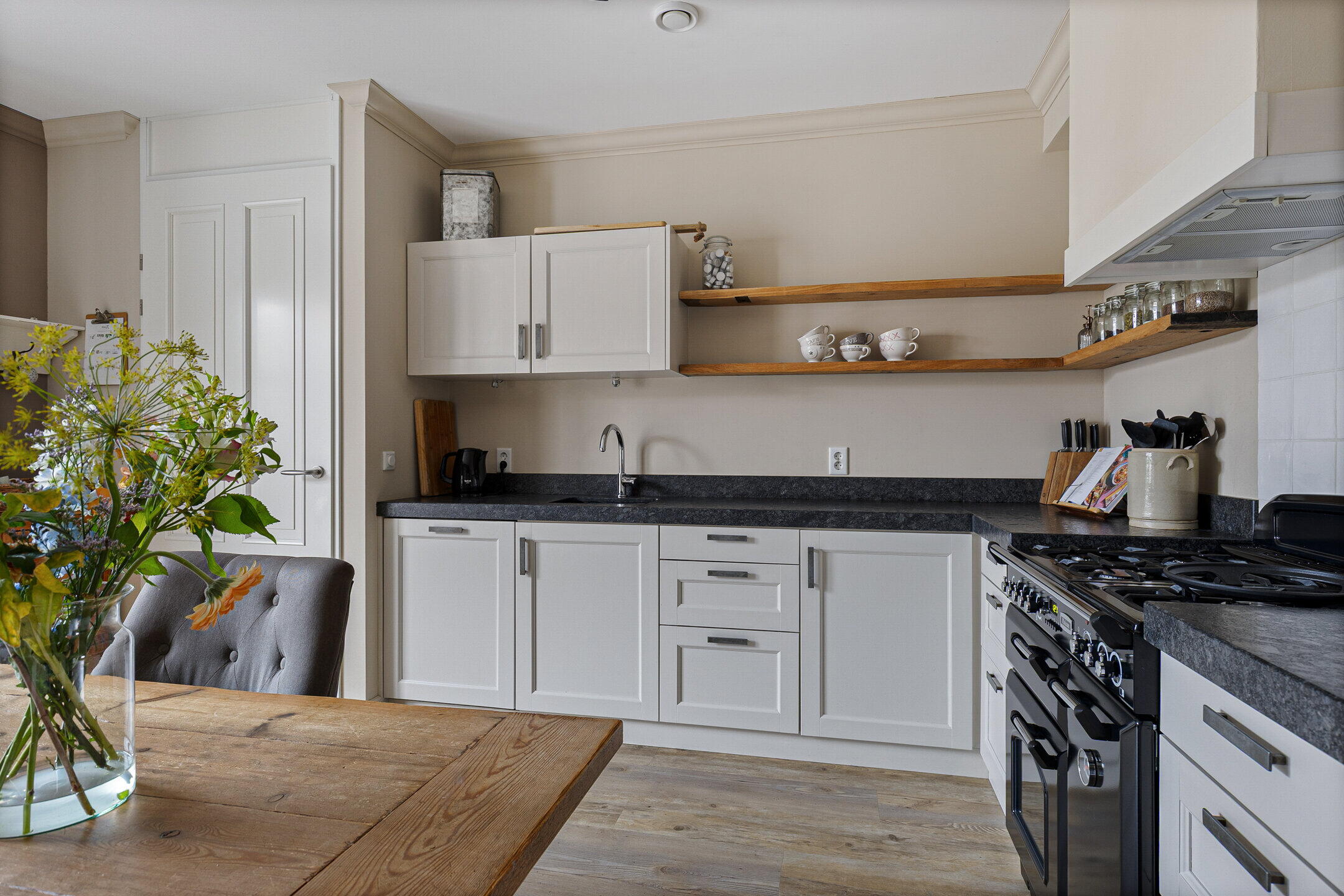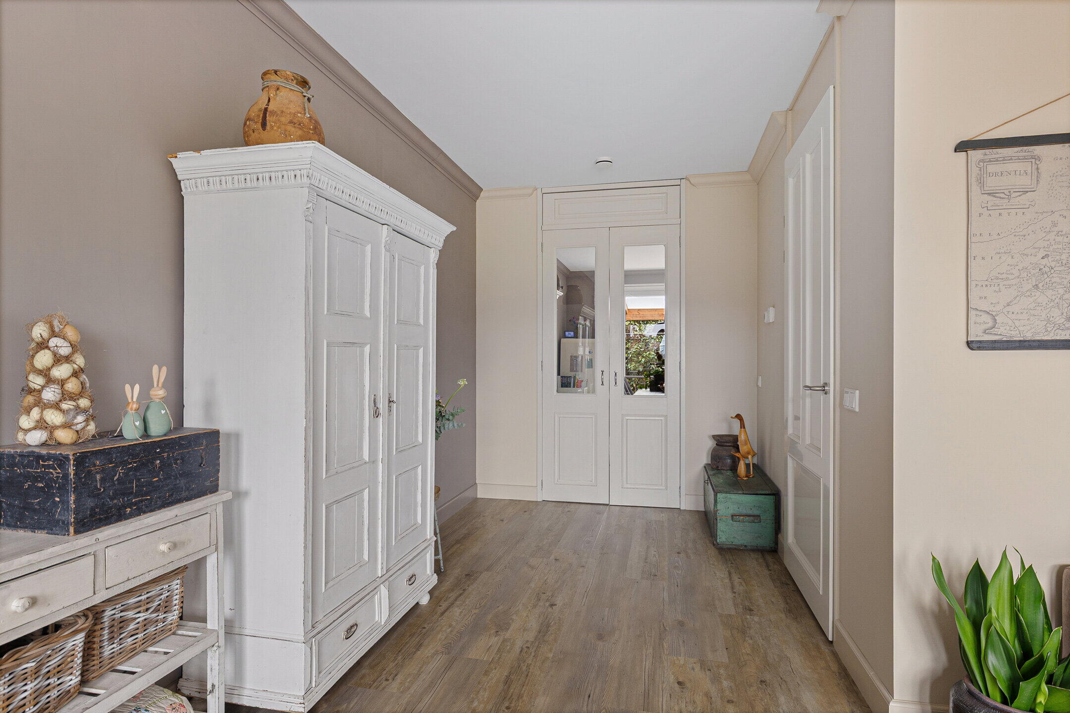 De badkamer is compleet en modern uitgevoerd met een toilet, inloopdouche en een wastafelmeubel. In de hal bevindt zich een op maat gemaakte kastenwand met de witgoedopstelling, waardoor alles netjes is weggewerkt. Vanuit de hal is ook de inpandige garage bereikbaar, met een technische ruimte waarin de cv-installatie, hybride warmtepomp en omvormer van de zonnepanelen zijn gesitueerd.