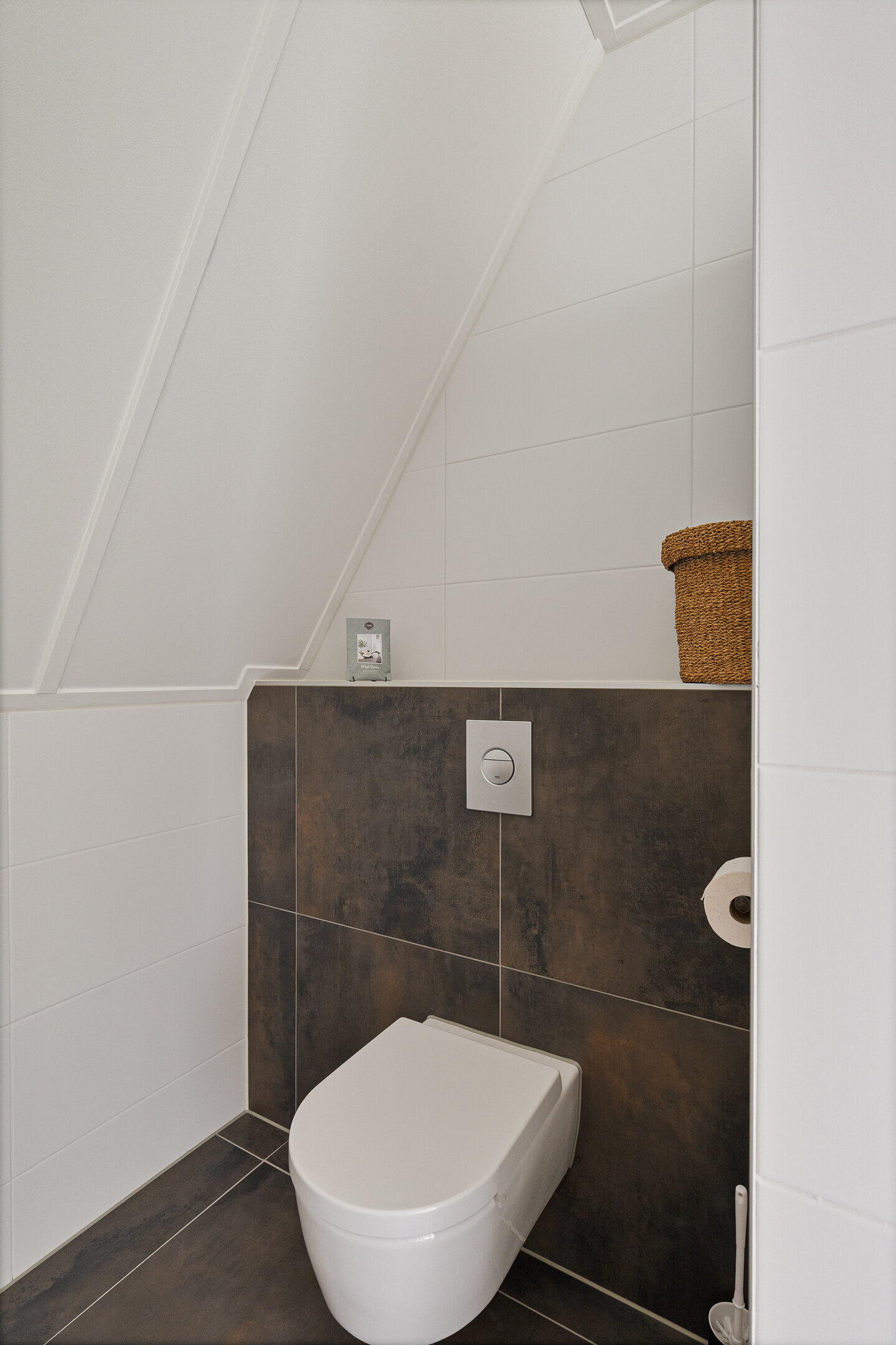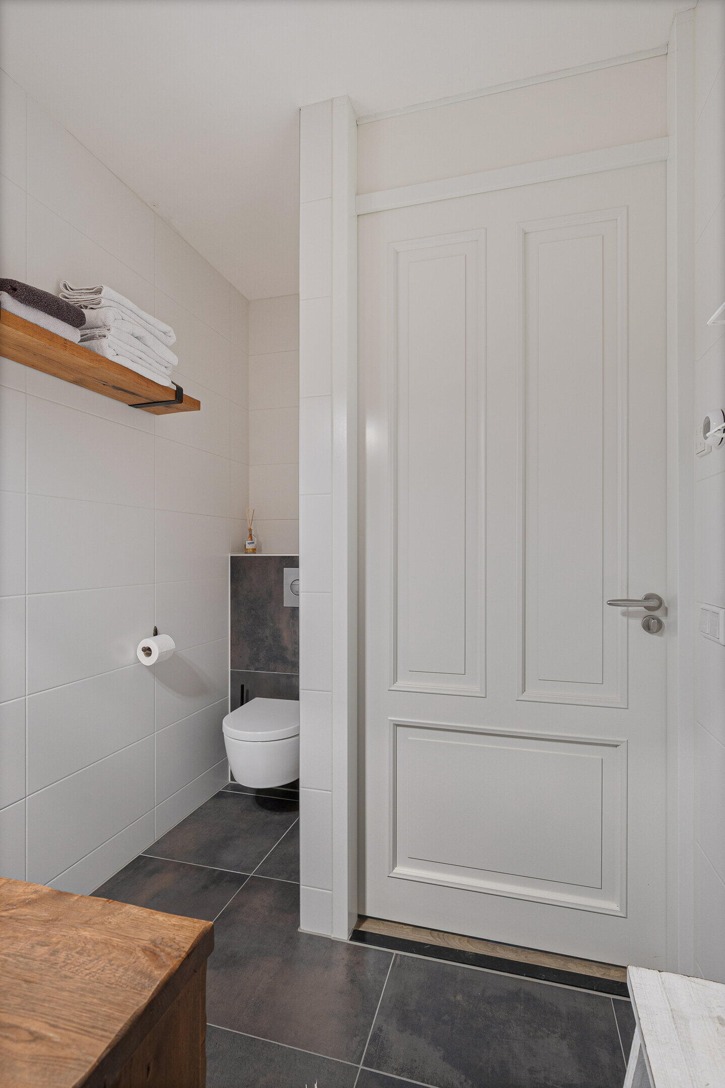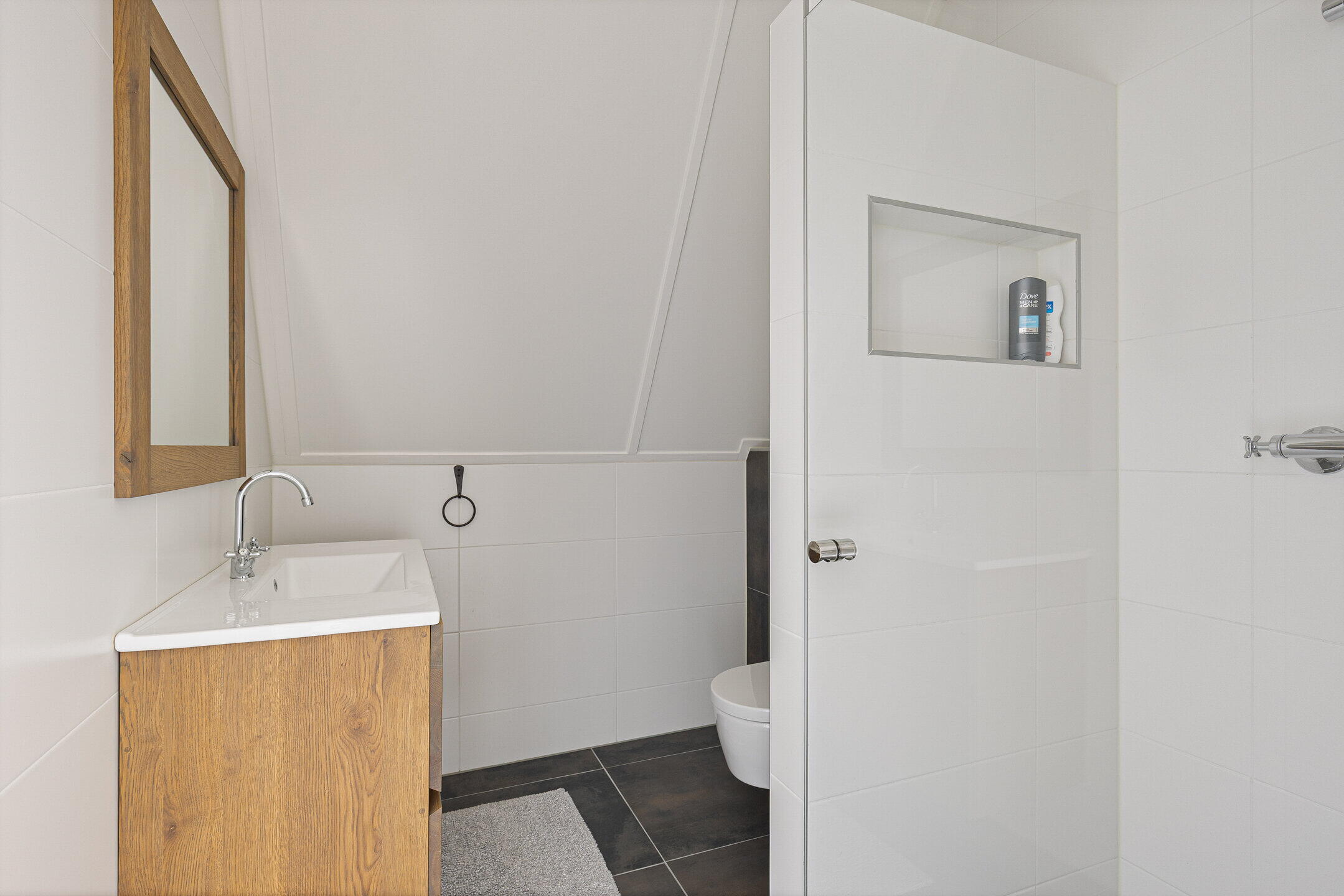 De badkamer is uitgerust met een toilet, inloopdouche en een wastafelmeubel. Op de overloop bevindt zich een luik met vlizotrap naar de bergzolder. De gehele verdieping is voorzien van vloerverwarming, wat zorgt voor extra comfort.
