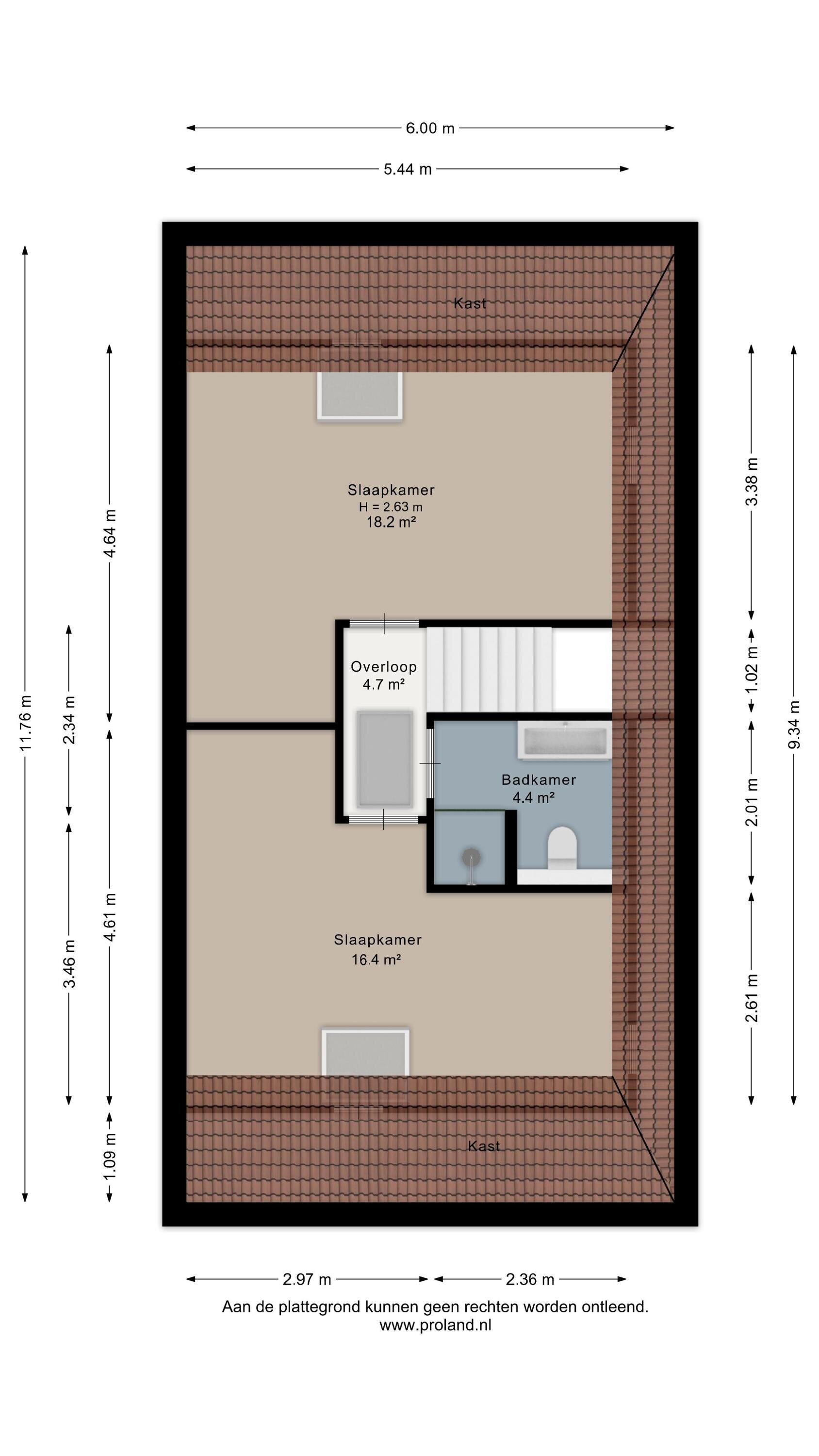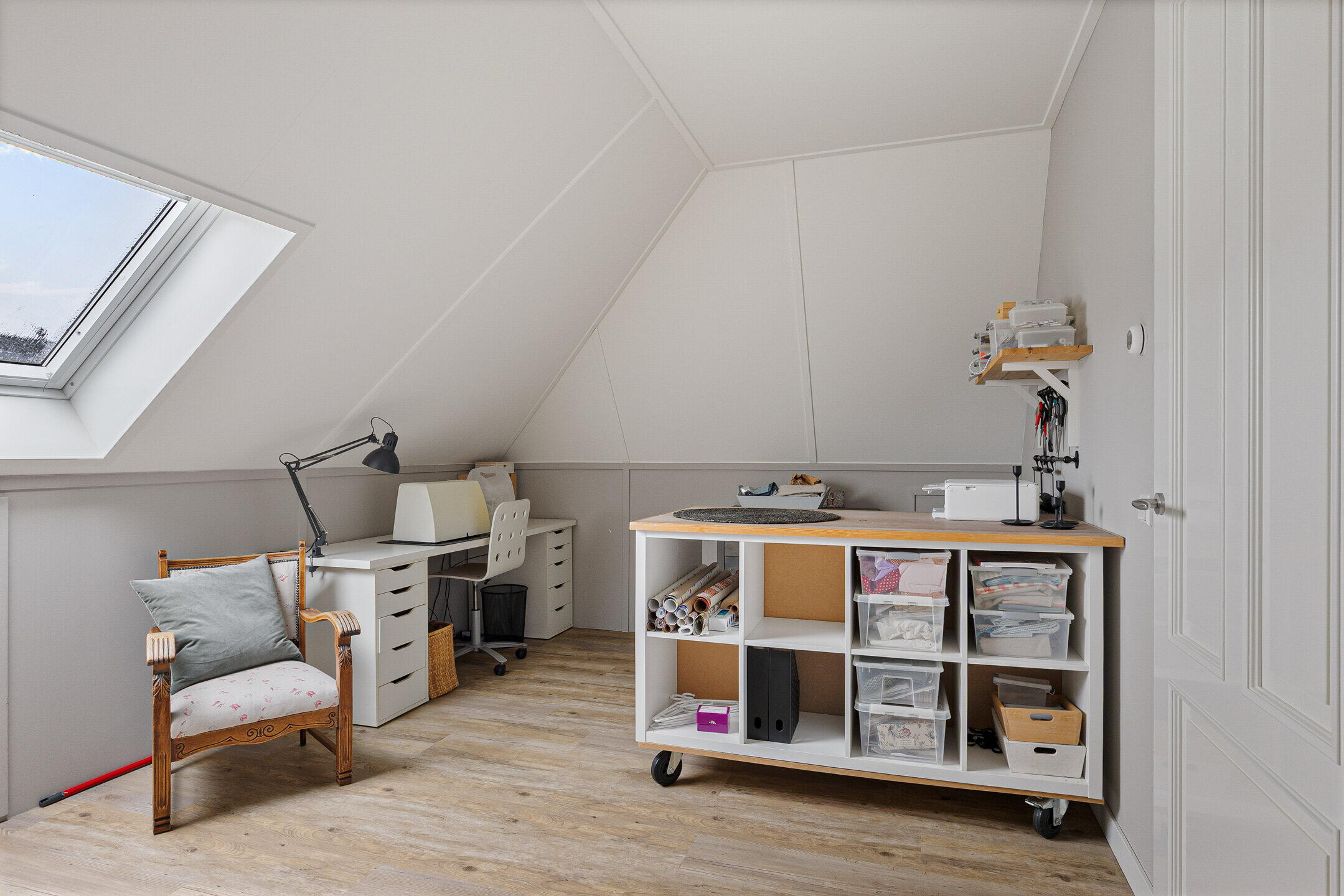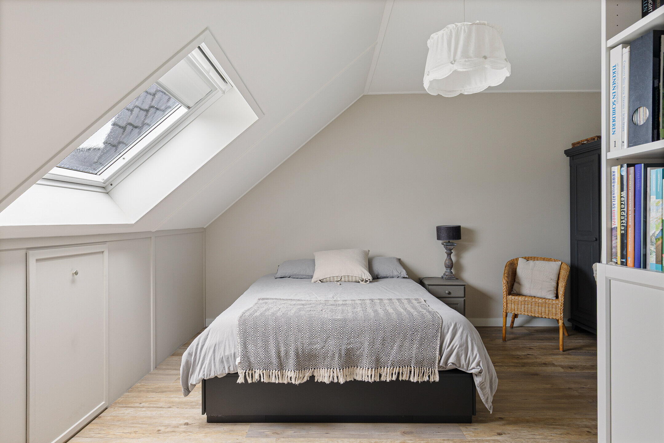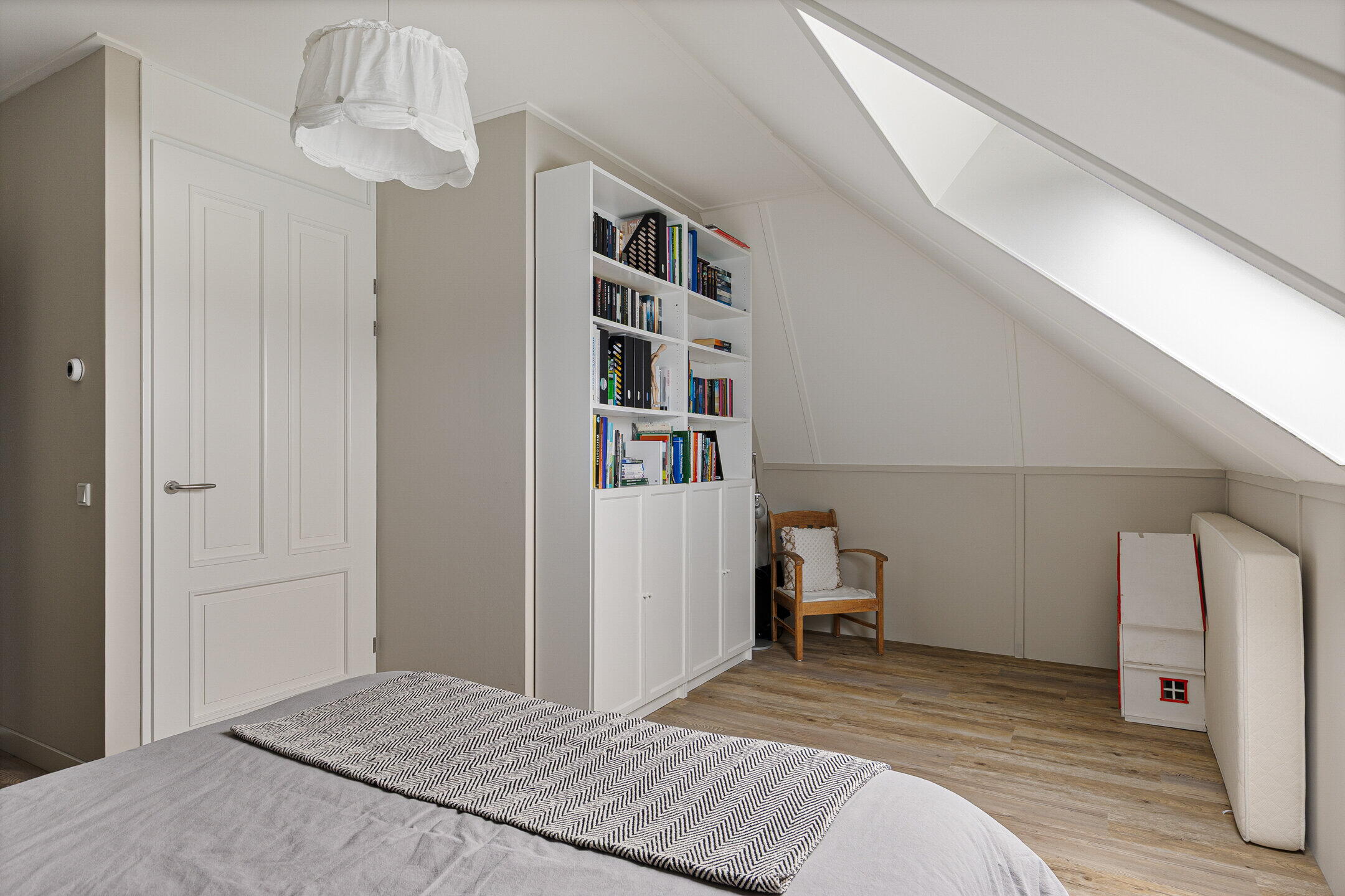 Overloop met toegang tot twee royale slaapkamers van respectievelijk 18,2 m² en 16,4 m², beide voorzien van een dakraam en praktische bergruimte achter de knieschotten.