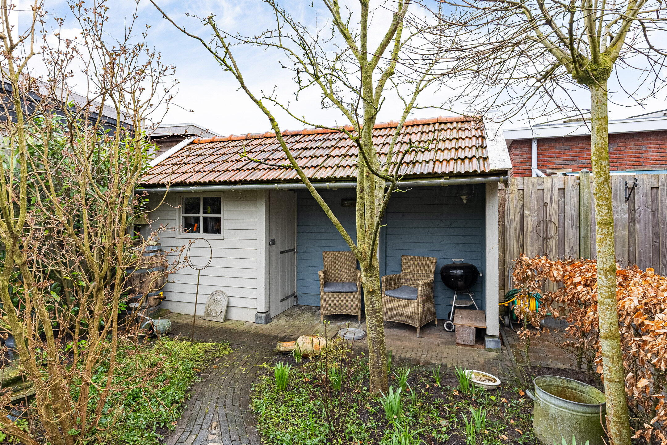 Achterin de tuin staat een vrijstaand houten schuurtje met een overkapt gedeelte, ideaal voor extra bergruimte of een beschutte plek voor tuinbenodigdheden.